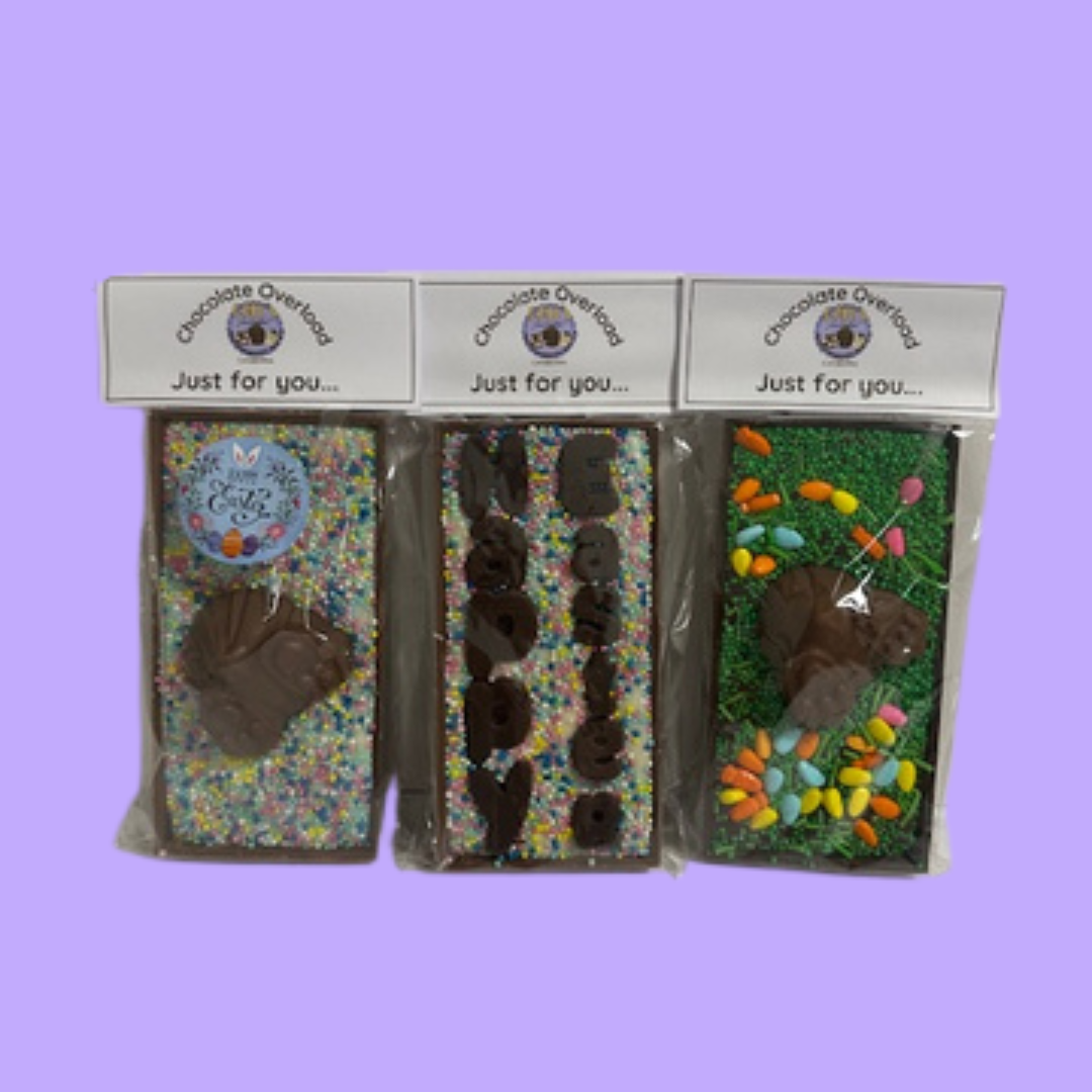Chocolate Overload is Kate's take on a classic chocolate bar, but in delicious Chocolate Crack flavours. This bar is a Belgian Callebaut milk chocolate shell, filled with even more chocolate, sprinkles and a chocolate bunny butt.