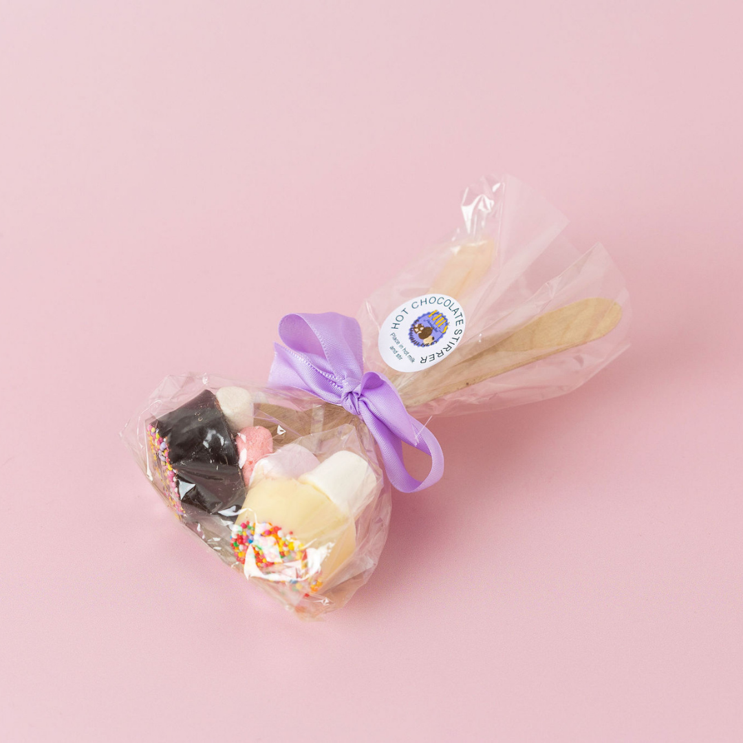 A two pack of delicious Belgian Callebaut chocolate (one white and one milk chocolate), sprinkles and marshmallows stuck on the end of a wooden spoon. Plunge into hot milk (or coffee) stir, stir, stir, and enjoy!